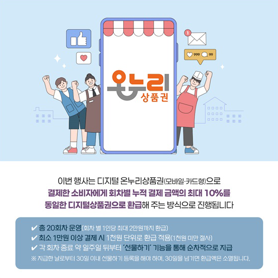 환급 행사는 디지털 온누리상품권(모바일형 및 카드형)을 이용해 일정 금액 이상 결제한 소비자에게 회차별 누적 결제금액의 최대 10%를 동일한 디지털 상품권으로 환급해주는 방식으로 진행됩니다. 참여 소비자는 각 회차별로 최대 2만 원까지 환급받을 수 있으며, 총 20회차에 걸쳐 운영됩니다.