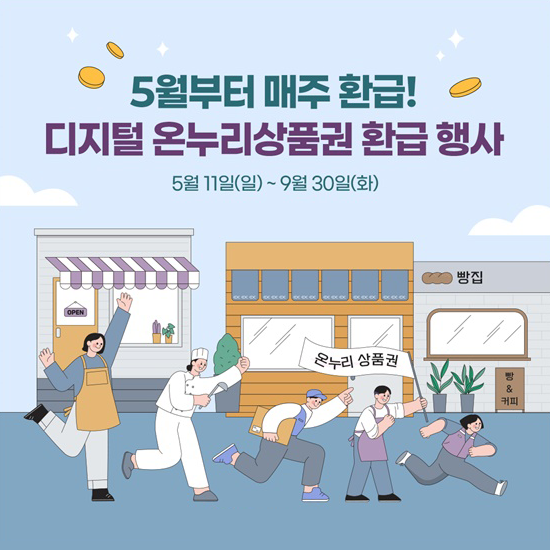 2025년 9월 30일까지 약 5개월간 전국 전통시장 및 골목형상점가 등 취약상권을 대상으로 디지털 온누리상품권 환급행사가 열립니다. 내수 진작과 전통시장 활성화를 위한 소비지원 정책인만큼, 알뜰하게 소비하시고 매주 최대 2만원의 혜택 놓치지 마세요!