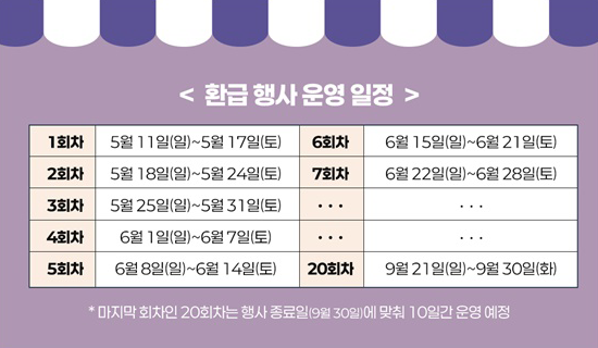 이번 환급 행사는 매주 일요일부터 토요일까지를 1회차로 구성하여 총 20회에 걸쳐 진행됩니다. 이와 같이 고정된 회차 운영을 통해 소비자 혼선을 줄이고, 지속적인 참여를 유도하는 것이 정부의 방침입니다.