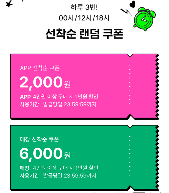 하루 3번! 00시/12시/18시 선착순으로 랜던 쿠폰을 받을 수 있습니다. 매장/App에서 4만원 이상 구매시 최대 1만원 할인됩니다.