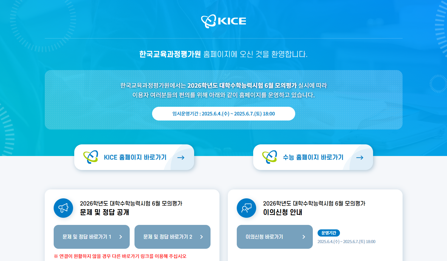 한국교육과정평가원에서는 2026학년도 대학수학능력시험 6월 모의평가 실시에 따라 이용자 여러분들의 편의를 위해 아래와 같이 홈페이지를 운영하고 있습니다. 임시운영기간 : 2025.6.4.(수) ~ 2025