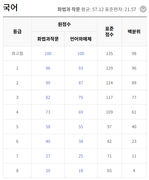 - 채점 결과 기준으로 나의 등급은 음영으로 표시됩니다. 성적 발표 확정 Update 04-14 13:48