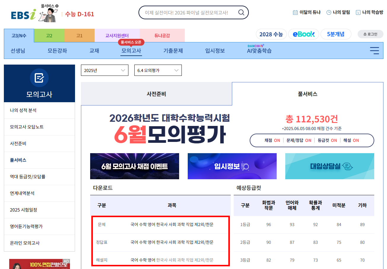 EBSi에서는 6월 모의고사 과목별 문제, 정답표, 해설지를 제공하고 있습니다.