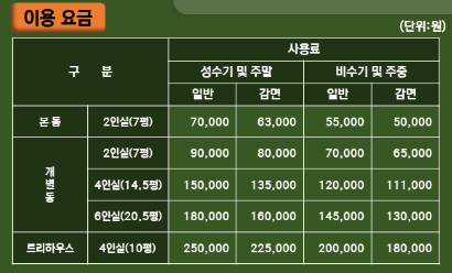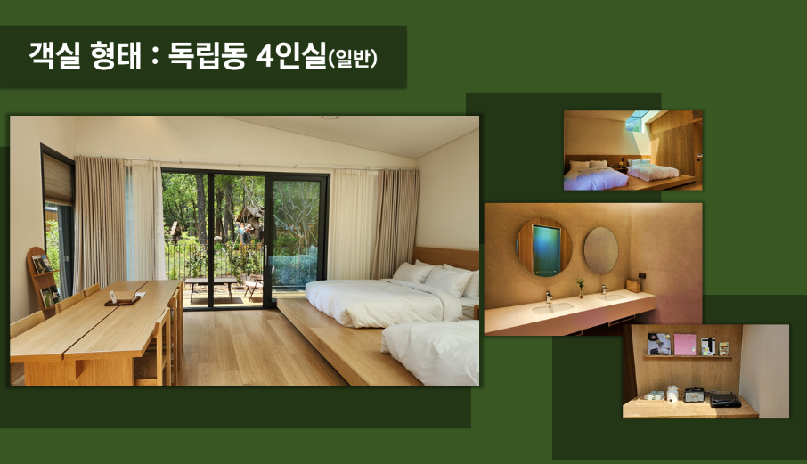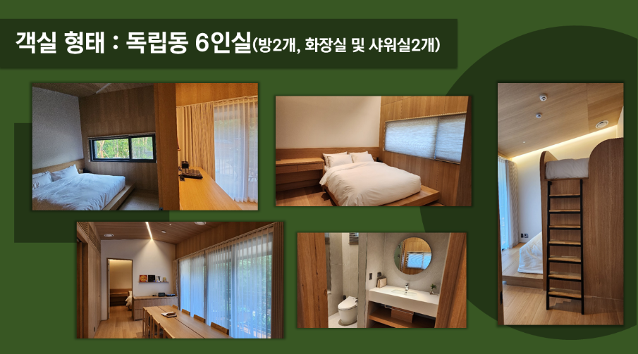 객실 종류 : 2인실(7평), 4인실(14.5평), 6인실(20.5평), 트리하우스(4인실,10평)