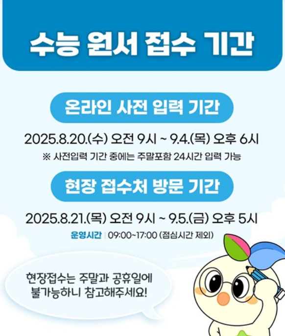 2026학년도 대학수학능력시험 응시원서 접수가 시작되었습니다. 올해부터는 온라인 사전입력 시스템이 전국적으로 도입되어 편의성이 높아졌지만, 사전입력만으로 끝나는 것이 아니라, 반드시 접수처를 방문해 접수증을 수령해야 접수가 완료됩니다. 이번 글에서는 수능 응시원서 접수방법, 접수기간, 접수처, 필수 준비사항을 꼼꼼히 정리해드리겠습니다.