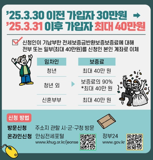 청년 외의 경우, 보증료 납부액의 90%를 한도로 최대 40만 원까지 지원됩니다.