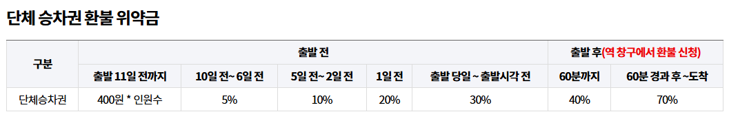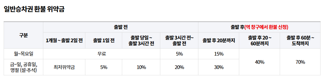 ㆍ열차 출발 전 환불 시점이 빠를수록 위약금이 적게 발생합니다.