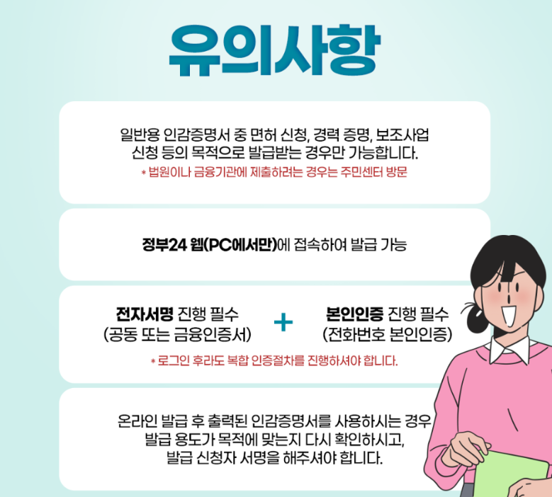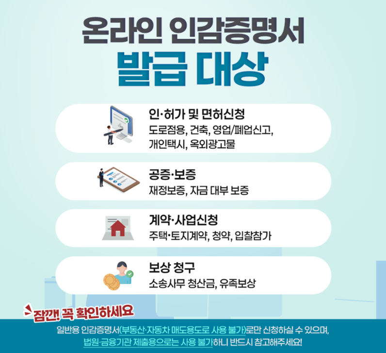 ㆍ온라인 발급 후 출력된 인감증명서를 사용하시는 경우, 발급 용도가 목적에 맞는지 다시 확인하시고, 발급 신청자 서명을 해주셔야 합니다.