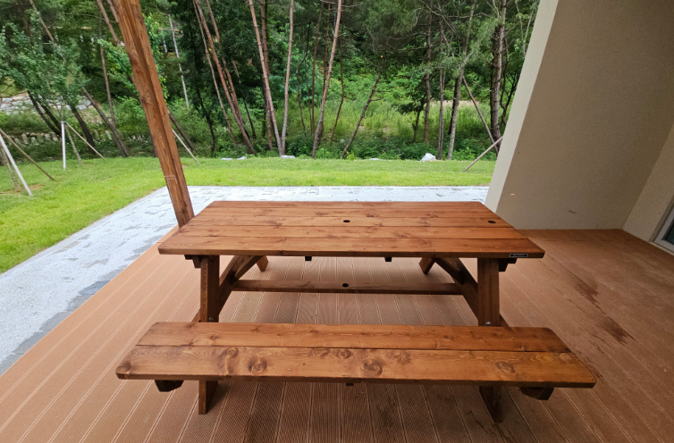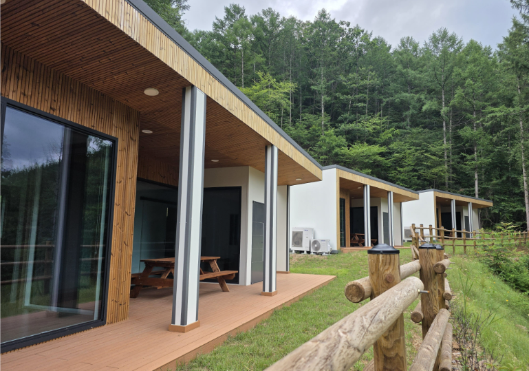 목조건축 및 목조가구는 원목 자체의 습도 조절, 단열 효과, 피톤치드의 방충 효과, 향균성 등이 있으며 원목 특유의 나뭇결과 옹이의 심미적 효과와 나무가 가진 고유의 향이 객실 내부를 더 돋보이게 해줍니다.