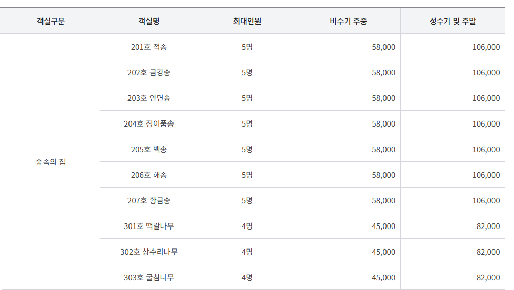 숲속의 집(최대인원4~5명) : 45,000원 ~ 106,000원