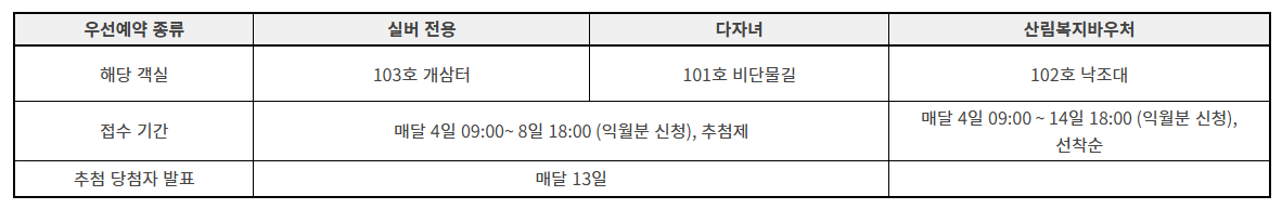 우선예약 객실의 경우 성수기/주중/주말 날짜 관계없이 익월분에 대해 신청을 받습니다.
