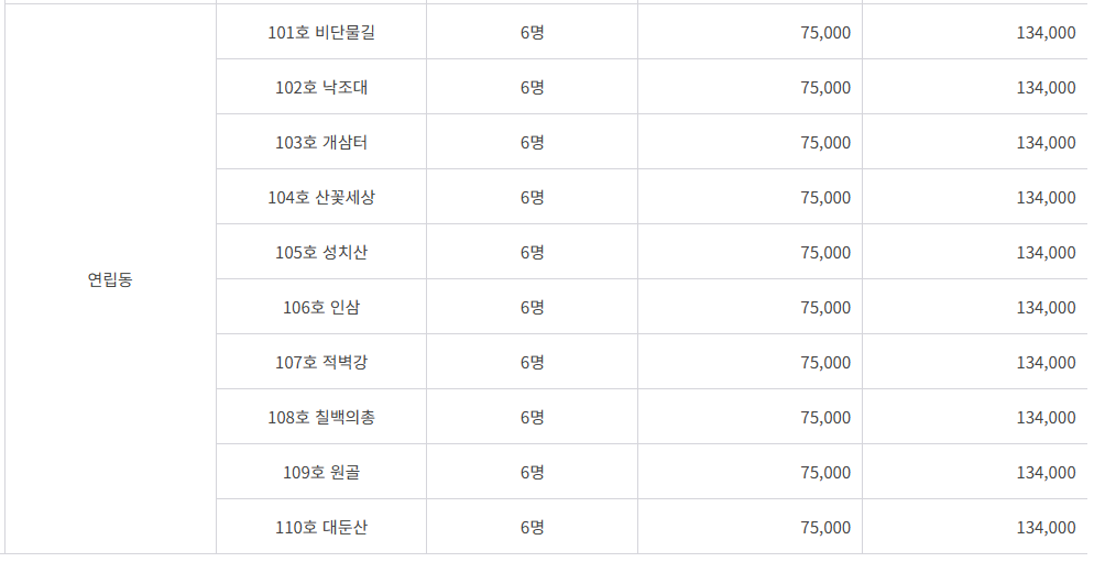 연립동(최대인원 6명) : 75,000원 ~ 134,000원