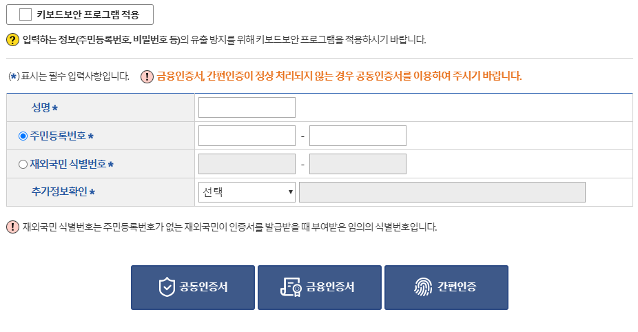 이용약관에 동의하고 공동인증서, 금융인증서, 간편인증 중 선택하여 인증합니다.