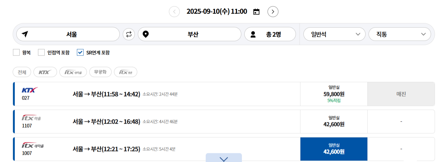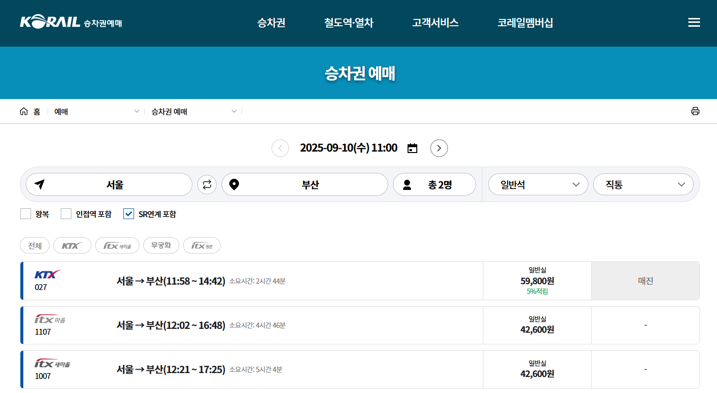 2. 출발역, 도착역, 날짜, 시간을 선택 후 검색